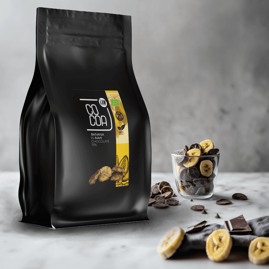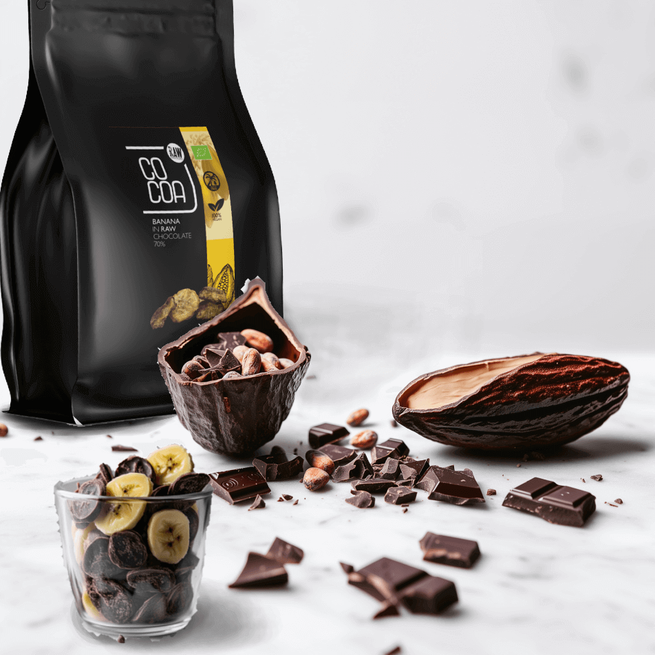 Nasza autorska surowa czekolada to prawdziwa gratka dla miłośników czekolad! Jest subtelna w smaku i pozbawiona mocnej goryczy. Surowa czekolada zapewnia nam intensywny smak ziaren peruwiańskiego kakaowca, które świetnie komponują się z słodyczą bananów. Gwarantujemy, że ta kombinacja zaskoczyła pozytywnie już niejednego smakosza słodkich przekąsek!