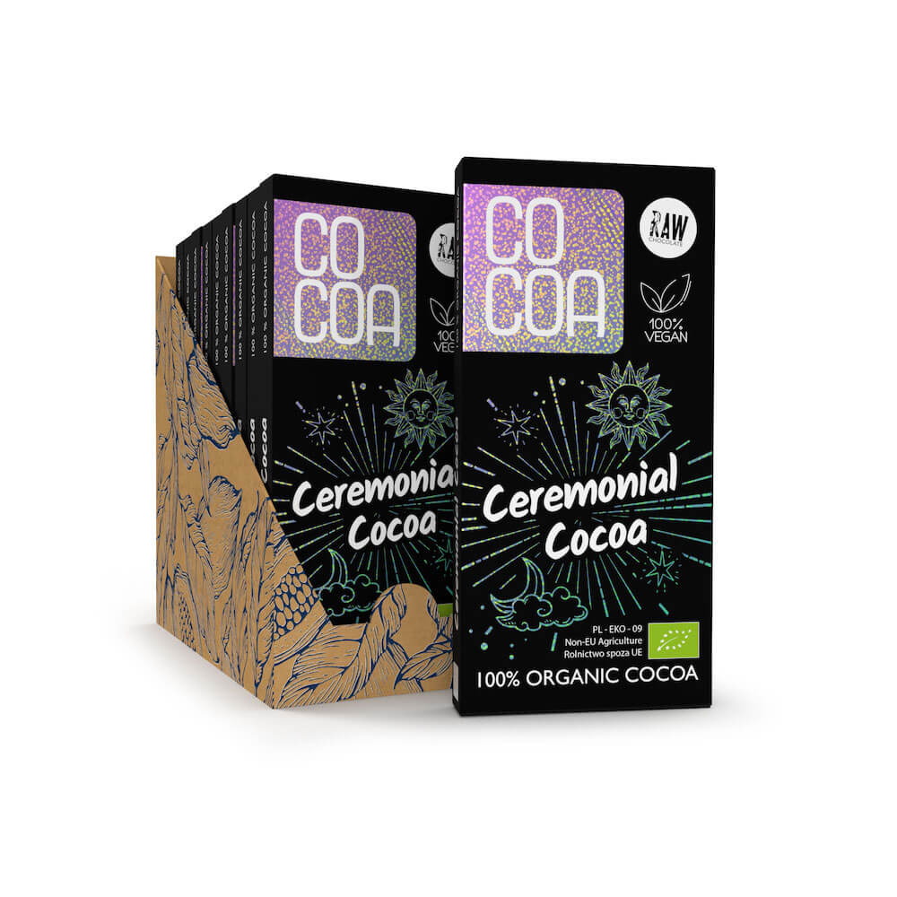 Kakao ceremonialne wytworzone z surowych ziaren kakaowca, w którym mocno wyczuwalny jest smak ziarna kakaowca. Zamknięte w wygodną formę tabliczki, aby przygotowanie kakao ceremonialnego było jeszcze prostsze. Zaskakuje łagodnością, przy czym nie jest pozbawiona swojego intensywnego charakteru.